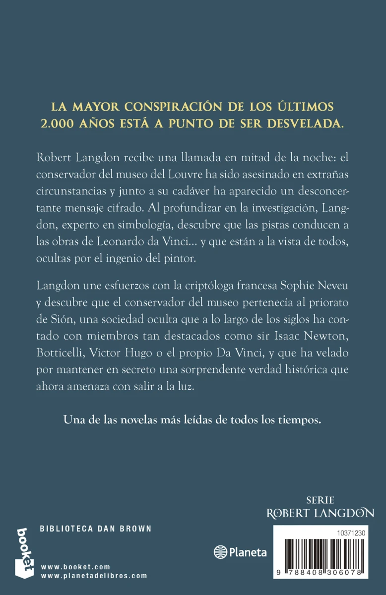 Una de las novelas más leídas de todos los tiempos, el fenómeno mundial que convirtió a Dan Brown en el maestro absoluto del thriller. La mayor conspiración de los últimos 2000 años está a punto de ser desvelada.