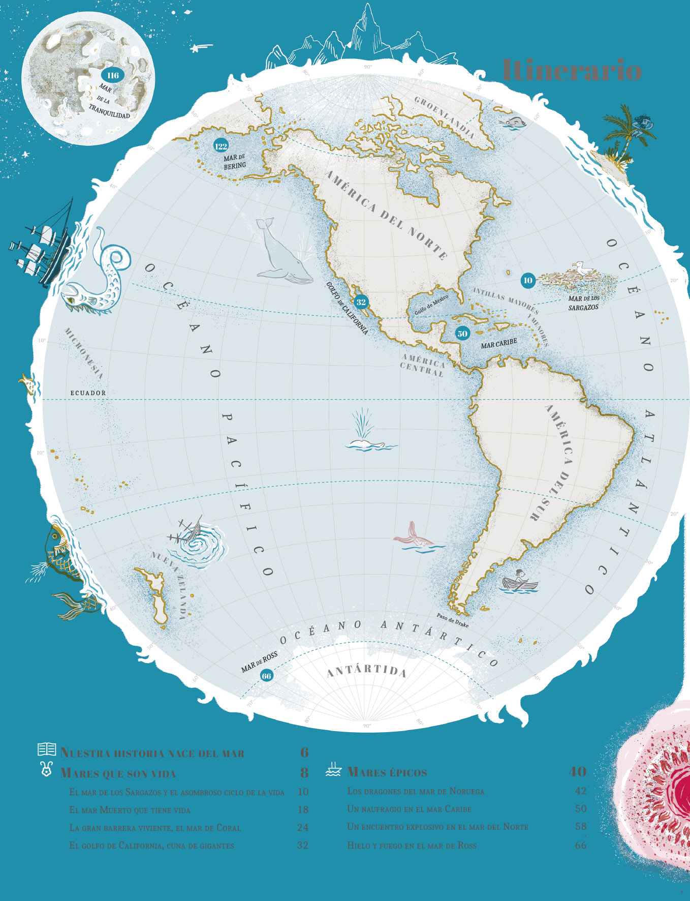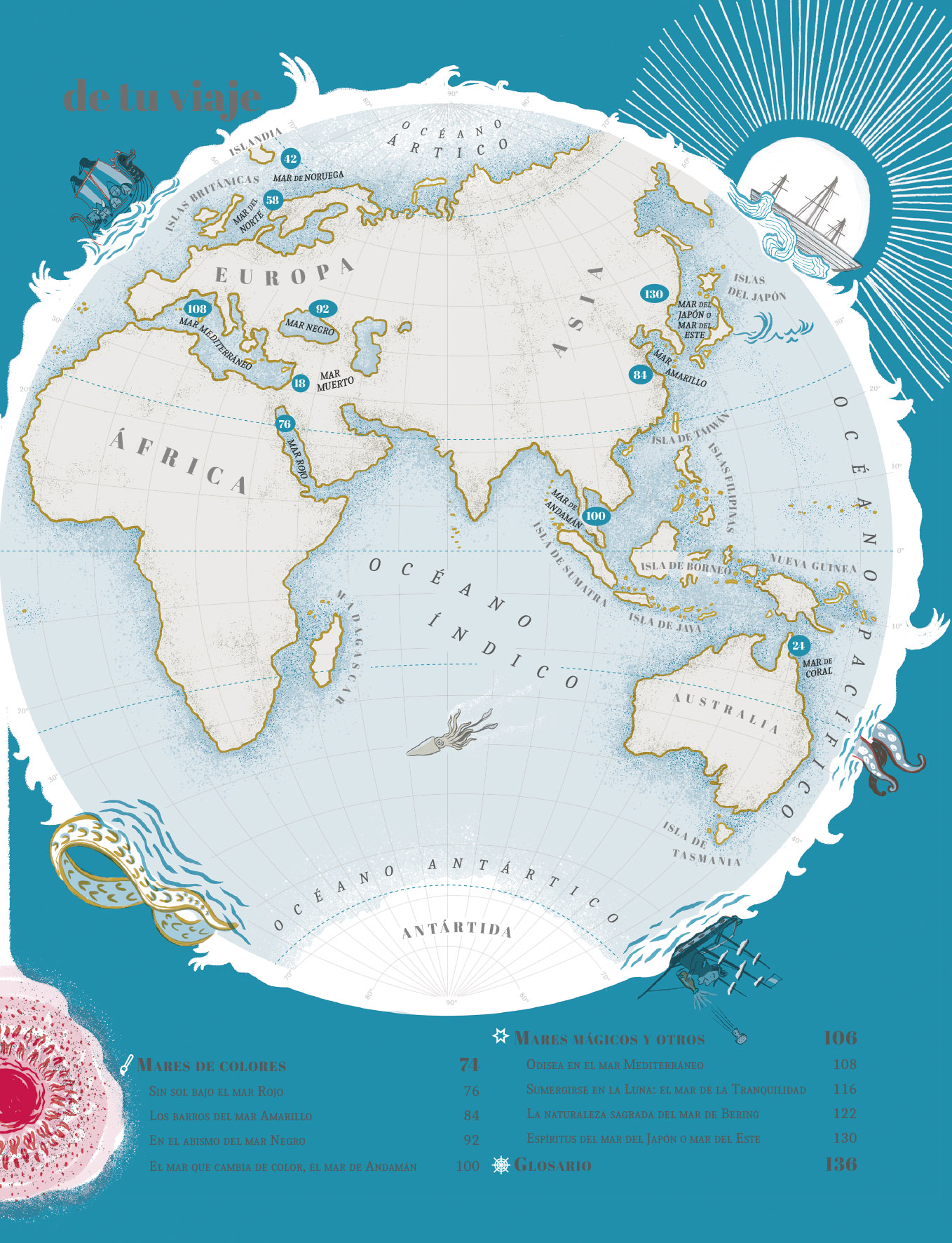 Desde el mar Rojo hasta el mar Amarillo, del mar de Coral al Mediterráneo, este libro es una travesía por paisajes reales y legendarios, un viaje para descubrir criaturas sorprendentes, arrecifes que laten como ciudades vivas, aguas que cambian de color y mitos que duermen bajo las olas.