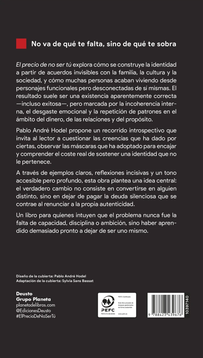 El precio de no ser tú explora cómo se construye la identidad a partir de acuerdos invisibles con la familia, la cultura y la sociedad, y cómo muchas personas acaban viviendo desde personajes funcionales pero desconectados de sí mismos. El resultado suele ser una existencia aparentemente correcta —incluso exitosa—, pero marcada por la incoherencia...