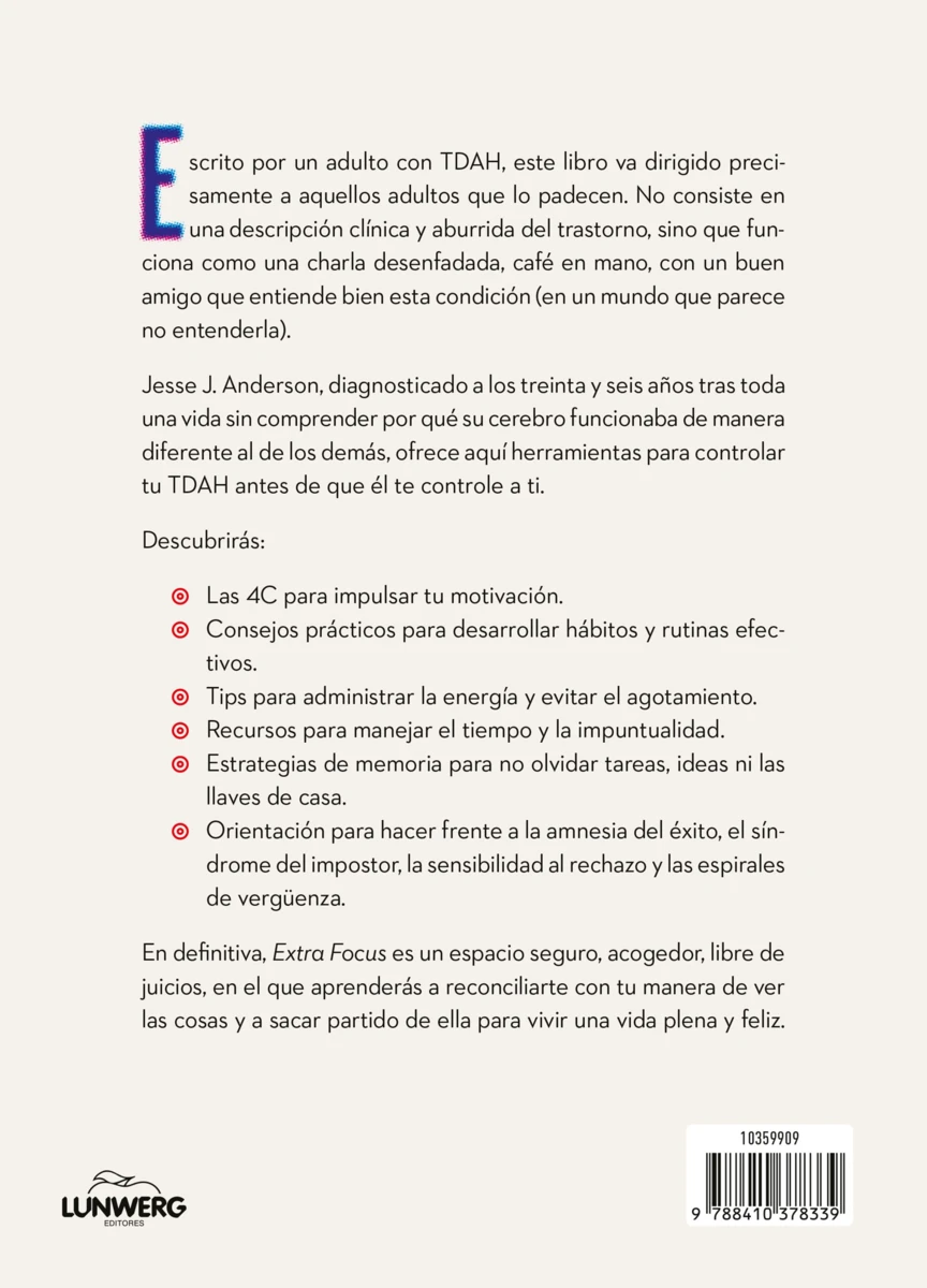 Jesse J. Anderson es escritor, conferenciante, coach, defensor del TDAH y creador de cosas. Diagnosticado a los 36 años, comparte su visión y sus experiencias viviendo con TDAH en el boletín semanal Extra Focus, con el que ayuda a los lectores a vivir bien con TDAH o a entender mejor a sus seres queridos. Bajo el nombre @adhdjesse, en sus redes sociales publica posts lúcidos, cercanos y con toques de humor sobre el TDAH. Medios como Today y Huffington Post se han hecho eco de su trabajo. Todavía no ha alcanzado todo su «potencial», pero escribir este libro es un buen comienzo. Vive en Puyallup (Washington) con su mujer y tres hijos.