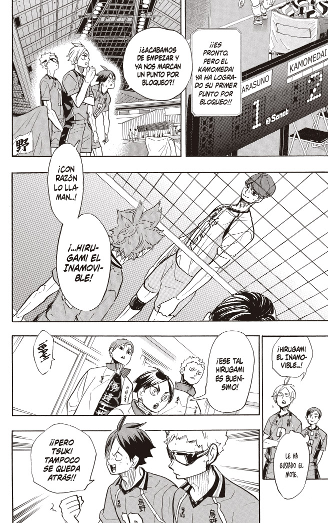 ¡En los cuartos de final de torneo de primavera saltan chispas entre Hinata y Hoshiumi, los rematadores más bajitos, desde los primeros compases del partido! El Kamomedai anula a Hinata con un bloqueo sistemático muy sofisticado centrado en Hirugami, mientras que, en el Karasuno, ¡¡Tsukishima le para los pies a...