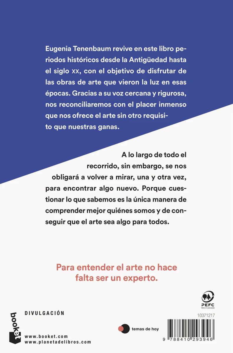 Eugenia Tenenbaum revive en este libro periodos históricos desde la Antigüedad hasta el siglo XX, con el objetivo de disfrutar de las obras de arte que vieron la luz en esas épocas. Gracias a su voz cercana y rigurosa, nos reconciliaremos con el placer inmenso que nos ofrece el arte sin otro requisito que nuestras ganas.