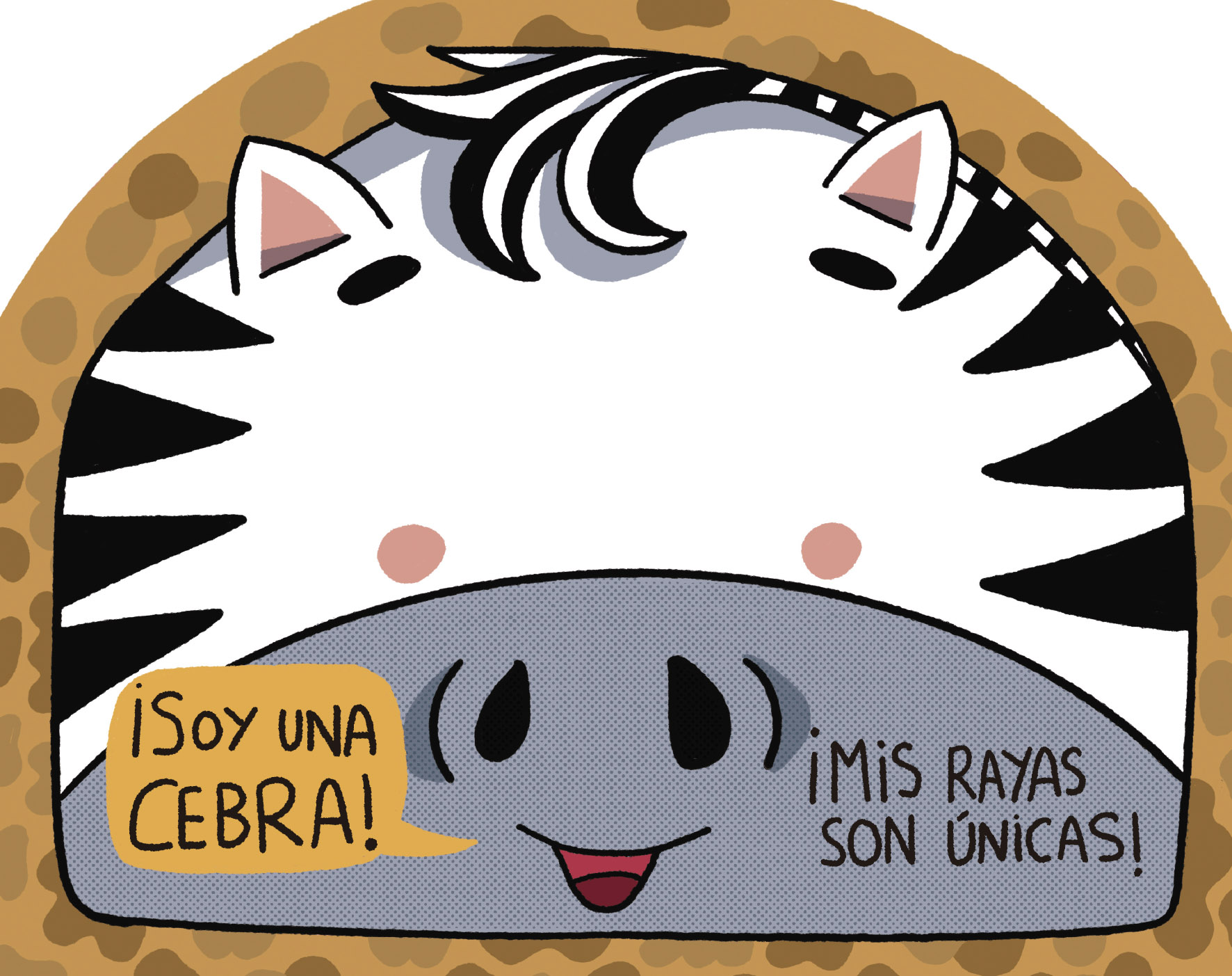 ¡Un libro lleno de animales de la sabana con un formato diferente! Pensado para agarrarlo por los agujeros laterales, ponerlo delante de la cara como si fuera una máscara y pasarlo fenomenal.