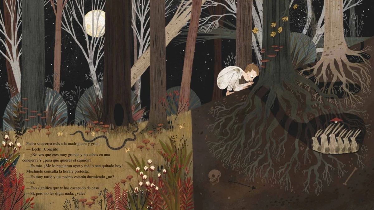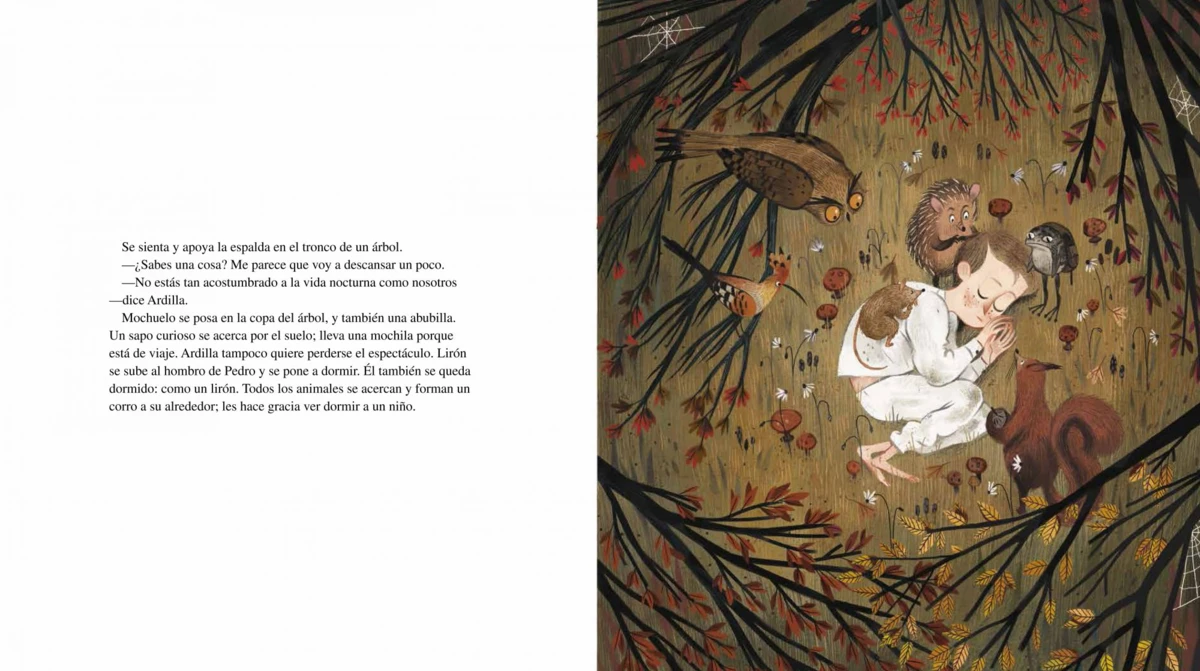 Un niño que se llama Pedro ha salido de su casa de noche y se ha adentrado en el bosque para recuperar su camión de bomberos. Unos cuantos animales lo observan con curiosidad. Un búho, una ardilla, un erizo...